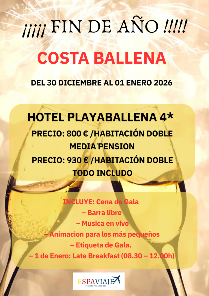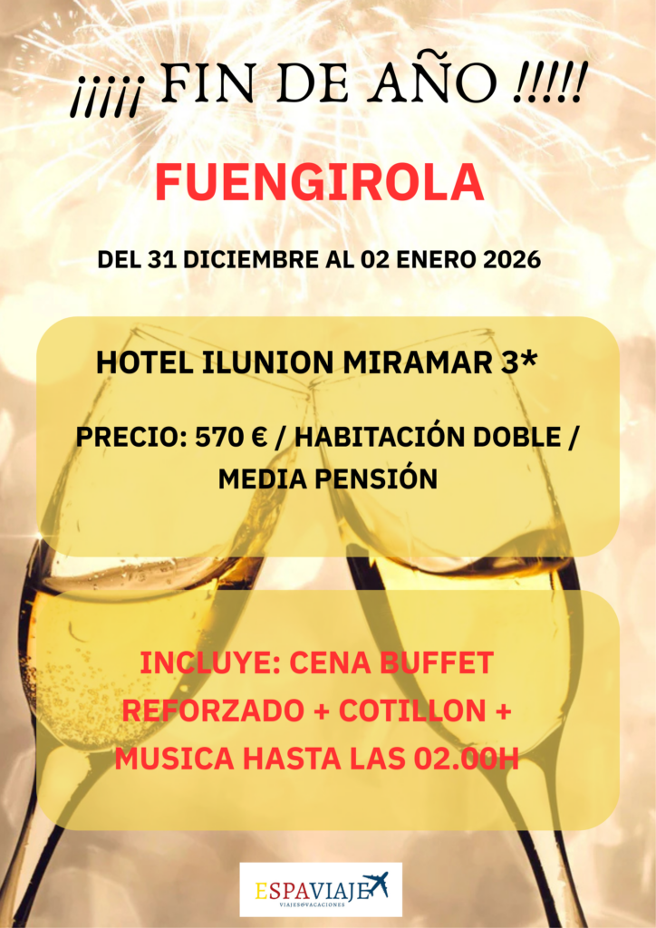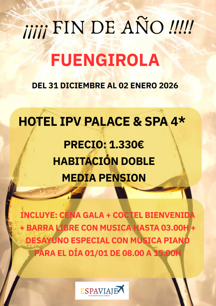DEL 31 DICIEMBRE 2025 AL 02 ENERO 2026 PRECIO POR PERSONA EN HABITACIÓN DOBLE RÉGIMEN DE MEDIA PENSIÓN CENA GALA + COCTEL BIENVENIDA + BARRA...