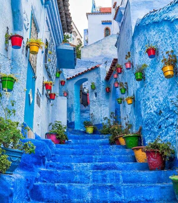 Desayuno y continuación del viaje a Chaouen, asentada en un valle en la cordillera del Rif. Su