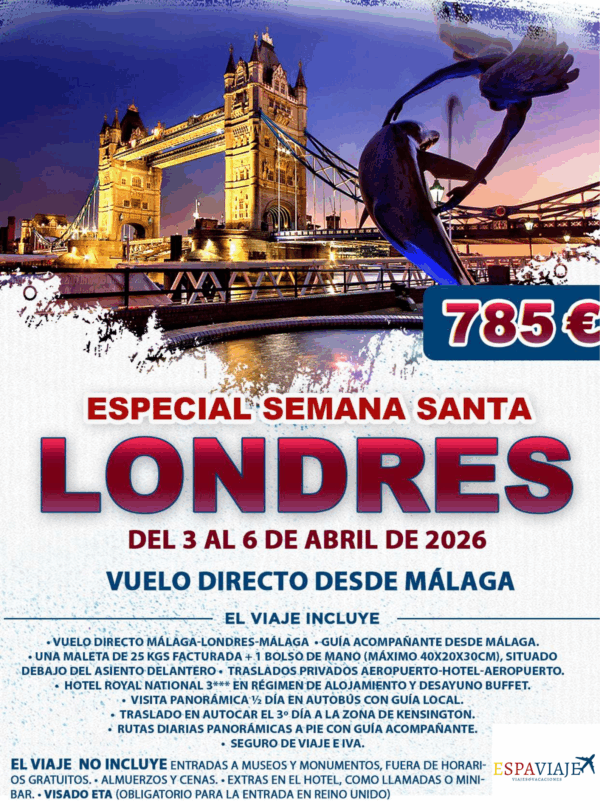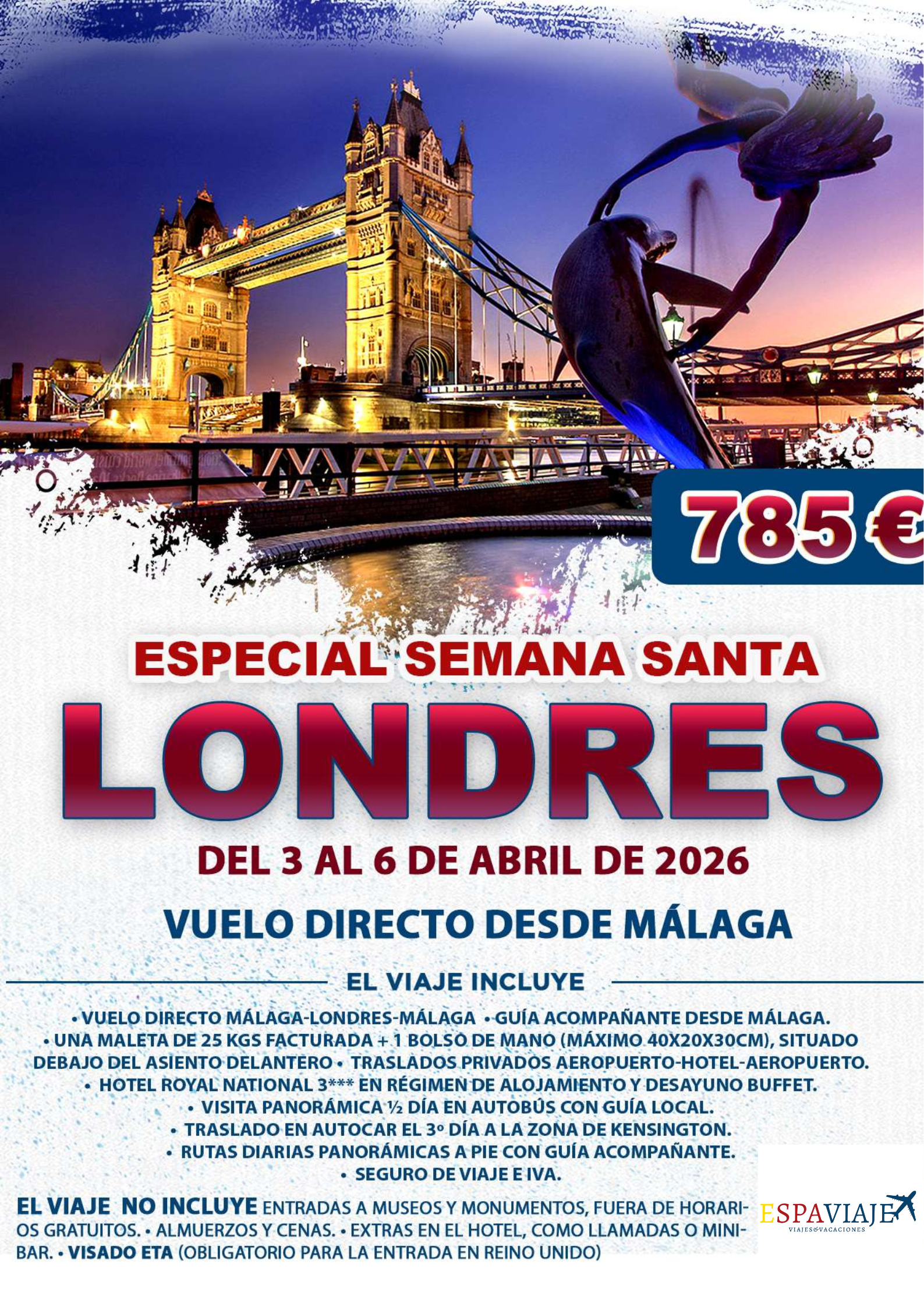 VUELOS: DA: 03 ABRIL: MÁLAGA - LONDRES : 12.50 HRS - 14.45 HRS REGRESO: 06 ABRIL: LONDRES - MÁLAGA : 20.55 HRS - 00.55 HRS